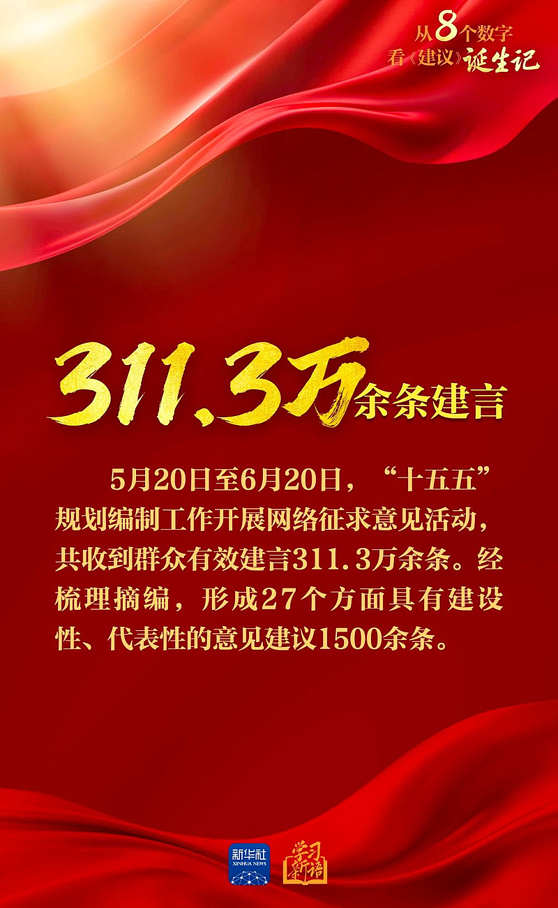 今天,新华社播发通讯《为基本实现社会主义现代化奠定更加坚实的基础——<中共中央关于制定国民经济和社会发展第十五个五年规划的建议>诞生记》。通过一组数字,一起来看这份纲领性文件是如何诞生的。