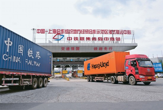 加快发展多式联运,是推动交通物流降本提质增效的关键举措,也是构建现代化综合交通运输体系的必然要求。图为2025年8月27日,货运卡车从位于山东青岛的中国-上海合作组织地方经贸合作示范区多式联运中心驶出。 新华社记者 李紫恒/摄